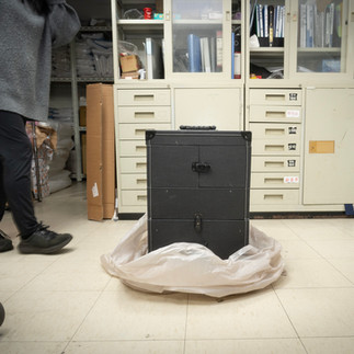 (李安琪平時所使用的化妝工具箱,為往身者使用的彩妝與一般化妝用品差不多,因此過去曾招募回收二手彩妝用品、右邊為從美國進口的大體專用粉底,其特性較適合應用在退冰後的肌膚上)